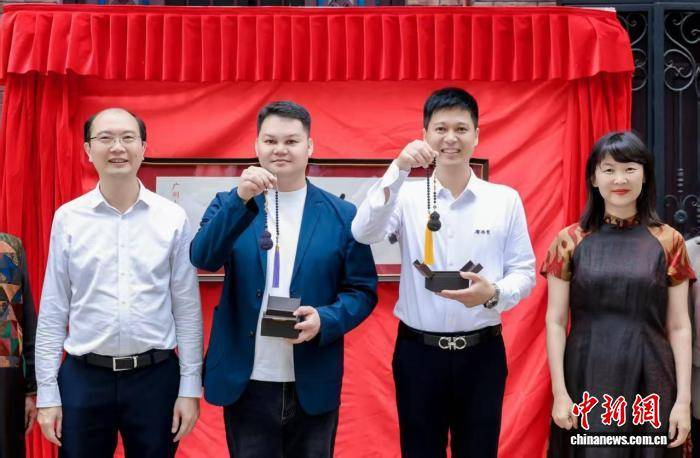 “广州大德国医坊·广州茶居”与“巴西里约热内卢·广州茶居”结为友好合作茶居,双方代表互赠精心制作的中医药香牌。广州市侨联供图
