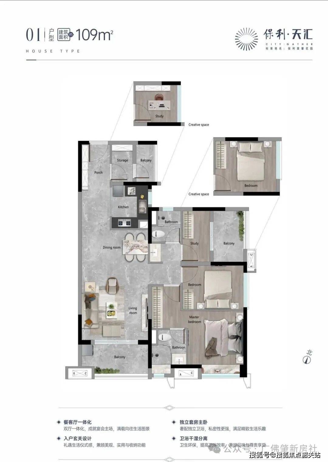 户型设计核心亮点:所有户型均采用南北通透设计,采光充足、通风效果好,避免潮湿闷热;户型方正,布局合理,动静分区清晰,休息区与活动区分开,互不干扰;同时注重收纳空间设计,预留充足的收纳位置,满足家庭日常收纳需求。