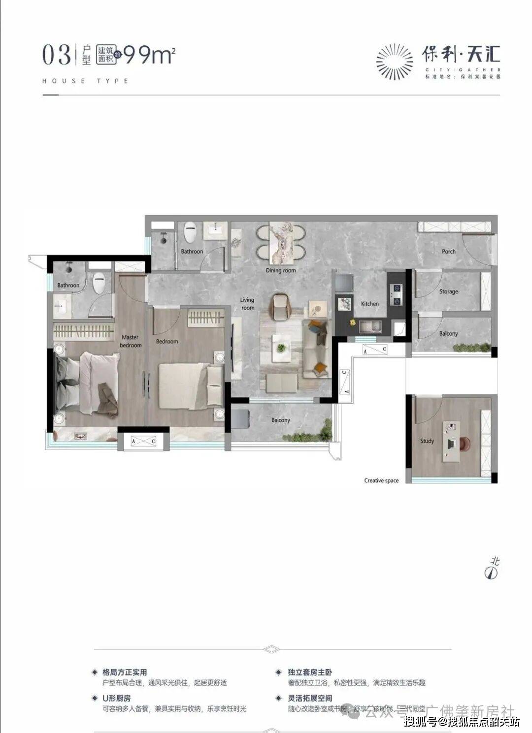 户型一:99㎡三房两厅两卫(刚需首选,性价比之王):该户型为在售五期最小面积户型,也是刚需购房者的首选户型,得房率约78%,实测套内面积约77㎡,户型方正、南北通透,采光通风效果极佳,适合三口之家居住。