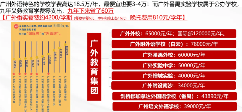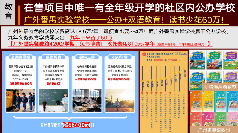 答:广外番禺实验学校为项目配建公办九年一贯制学校,业主子女可优先入读(最终以当年教育部门官方公示学区划分为准);学校实行九年义务教育,学费全免,九年可为家庭节省最高60万教育开支。
