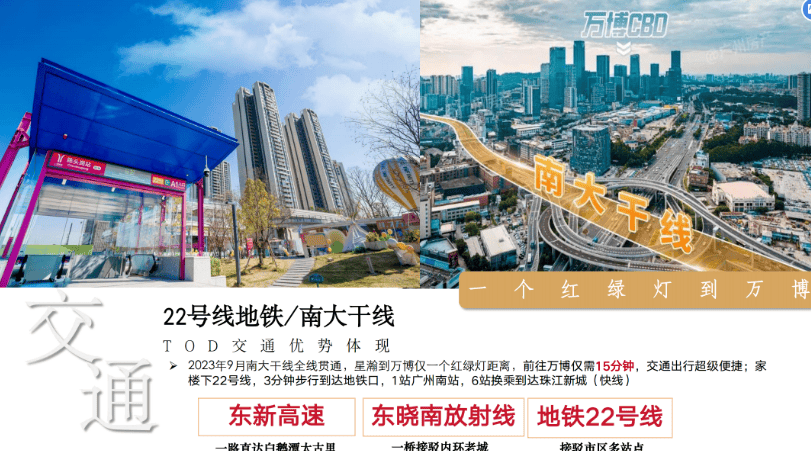 道路交通方面,项目紧邻南大干线,作为番禺区交通大动脉,南大干线千米,全线不设红绿灯,仅一个红绿灯距离即可到达万博商圈。南大干线串联广州南站商务区、长隆万博汉溪商贸旅游中心等三大商贸组团,往西可衔接佛山魁奇路,往东可连接东莞莲花大道,往南直达南沙自贸区,是粤港澳大湾区横向交通的重要动脉。从项目自驾出发,15分钟可达万博商圈,20分钟可达琶洲,30分钟可达珠江新城,高效连接全城核心区域。
