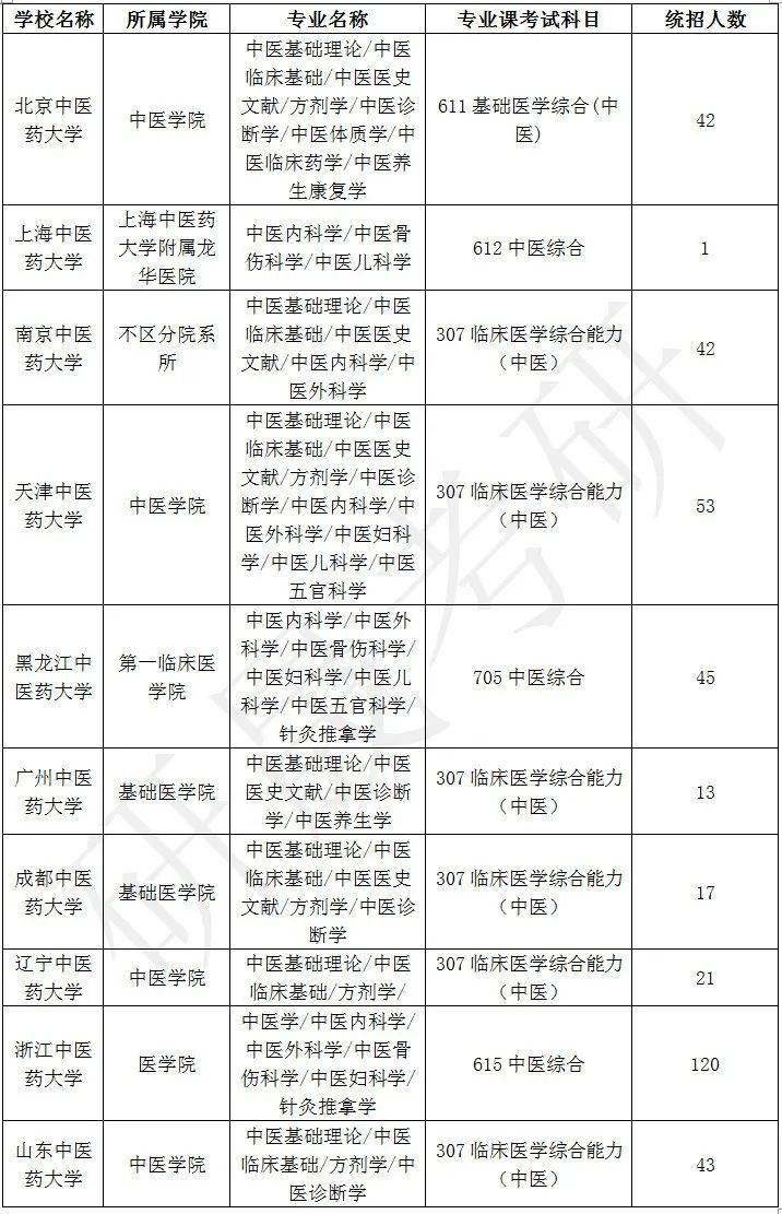 通过对各学校考试科目及招生人数的整理分析,天津中医药大学和浙江中医药大学招生人数是比较多的,报考这些学校的话,成功的胜算可能会相对更大一些;但是从专业课方面来看,以上10所学校的专业课考试科目基本相同,即便考纲或者参考书不一样,整体方向还是比较接近的,可以说,选择这个专业课,就等于给自己增加了学校的选择机会。