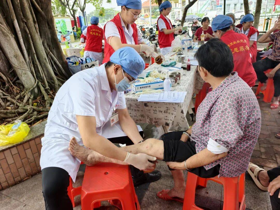 中医公益义诊区成为活动现场的焦点,陈金水医生现场坐诊,针对肩颈不适、脾胃虚寒、湿气过重等春季常见问题,进行一对一问诊答疑,并提供个性化调理建议。同时,东莞市中医院骨科护理团队同步开展火龙罐、耳穴压豆、刮痧、艾灸等中医特色理疗服务,为居民缓解身体不适,受到广泛好评。