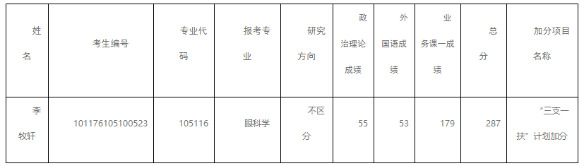 长治医学院2026年硕士研究生招生享受加分政策考生复试名单公示根据《教育部关于印发2026年全国硕士研究生招生工作管理规定的通知》(教学〔2025〕2号)精神,经考生申请,结合相关部门反馈名单,我校初审,以下考生享受初试总分加分政策(初试总分加10分)且达到我校复试分数线要求,特此公示。