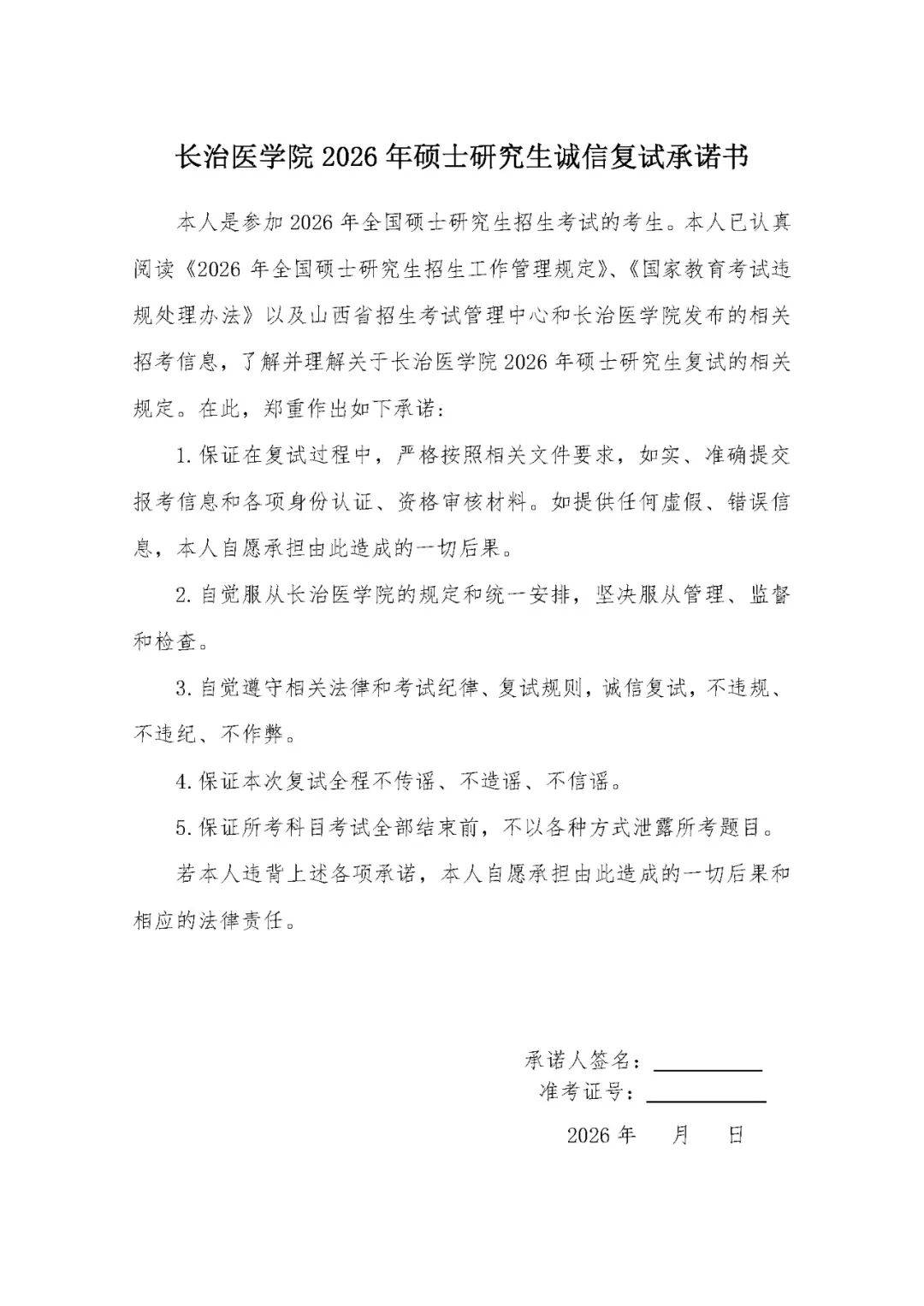 (二)非应届考生:《长治医学院2026年硕士研究生诚信复试承诺书》(附件1)、《思想政治素质和品德考核表》(附件2)、准考证、有效身份证件、学历证书、学位证书、《教育部学历证书电子注册备案表》或《中国高等教育学历认证报告》、本科成绩单。