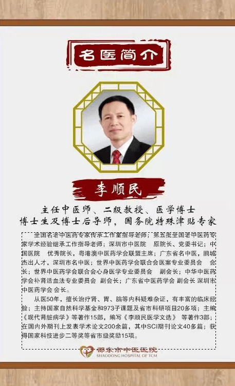 李顺民教授是邵东人士,享受国务院特殊津贴专家,深圳市中医院原党委书记、院长,广东省名中医,鹏城杰出人才,主持过20多项国家、省市级科研项目,主编《现代肾脏病学》等15部著作、发表200余篇学术论文(含40余篇SCI论文),并斩获国家科技进步二等奖等15项省市级奖励的权威专家,他融合“治病治人”“三气学说”等学术思想,针对肾病、脾胃病、脑系疾病,为每位患者制定个性化方案,并耐心解答疑问、传授养生知识。
