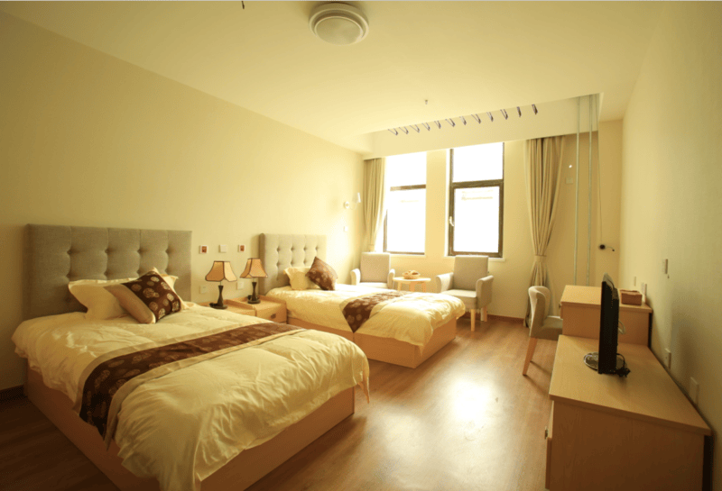 ▷ 设施配置 □ 规模:普亲长辛店老年养护中心建筑面积4000平米,配备电梯门禁、24小时监控、智能护理床、一键呼叫系统;□ 安全细节:卧室家具无尖角、适配轮椅使用,防滑静音地胶;□ 配套设施:康复训练设备、老年娱乐健脑器材,24小时中央热水。
