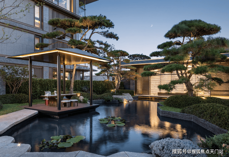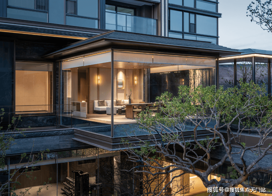 再往里走就是近460㎡的下沉式庭院,精选太行山金景石堆叠成小山丘,引进溪水汇聚成池塘,并移栽岭南珍贵的古桩铁冬青和中华原生乌桕树,形成一幅立体山水画卷。