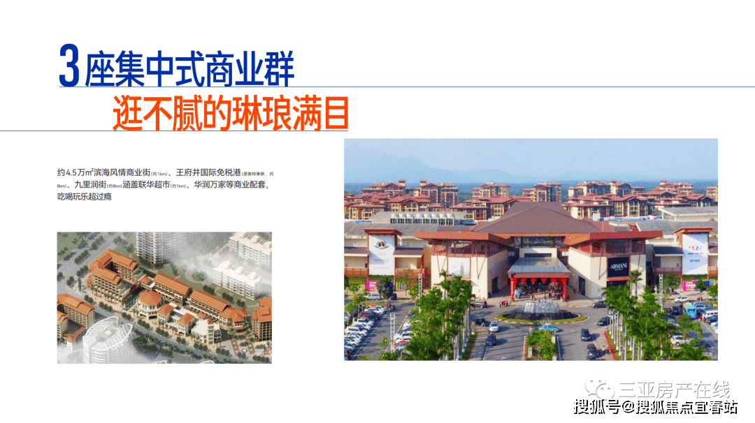 3座集中式商业群 —— 滨海风情商业街距项目约1km、约8km到达九里润街、约8km到达王府井悦舞小镇(原首创奥特莱斯购物中心)