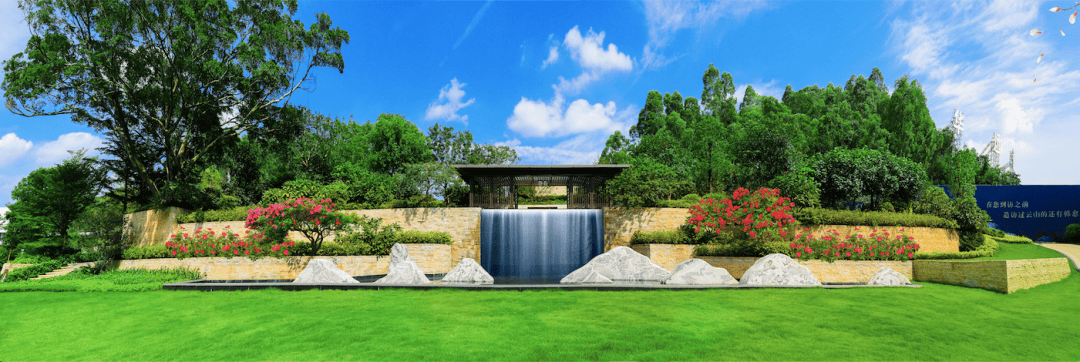 其承大国之院落,取云山之厚重,打造现代版履道坊——花溪谷,绿植山体环绕,重点打造瀑、潭、溪、涧、湖等不同形态的水景,配以桥、亭、阶、坡景成就一座院藏云山的大美园林。