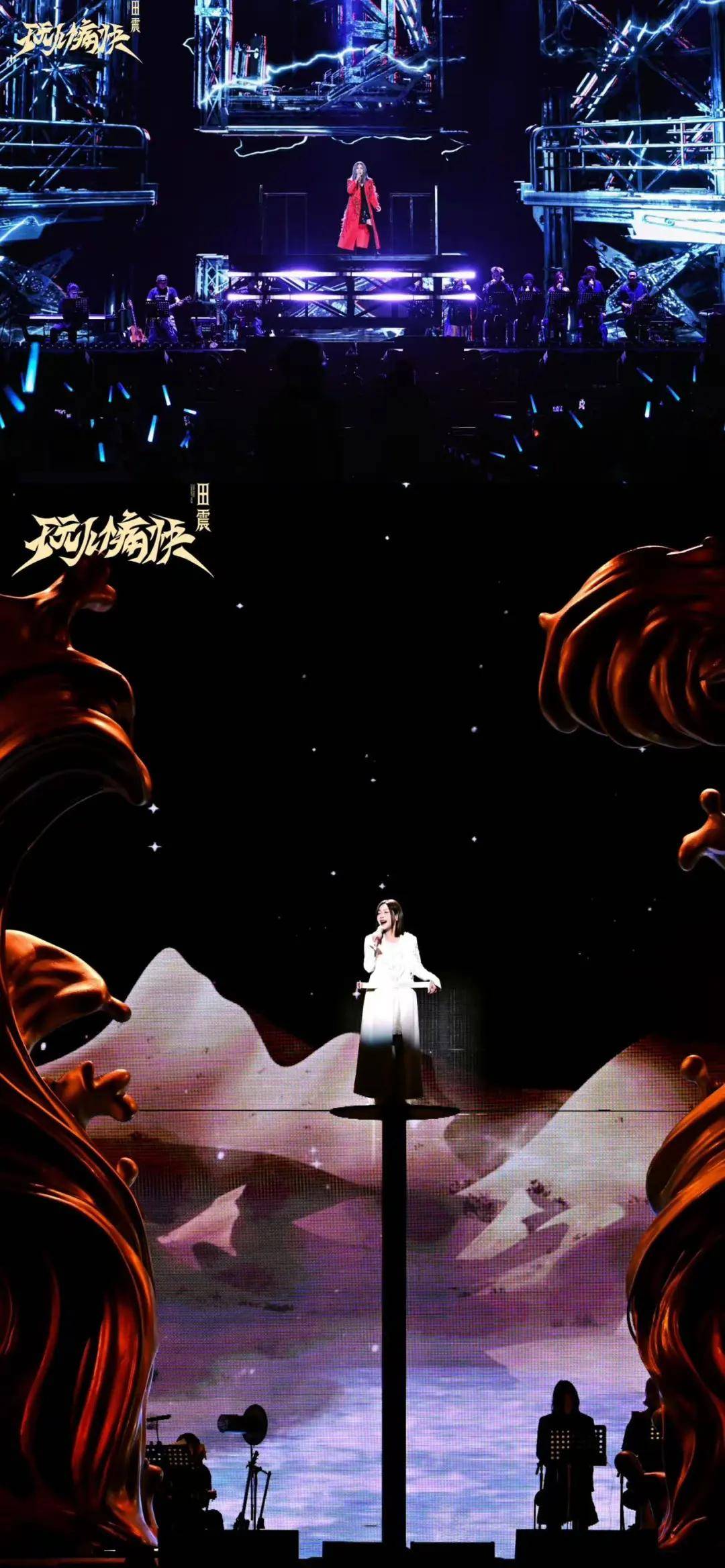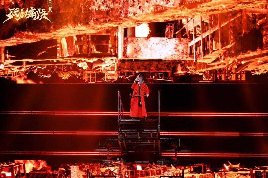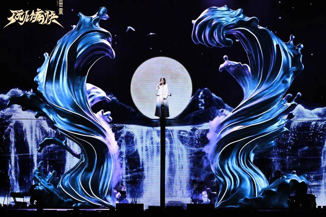 原本打算“轻装上阵”的田震,看到导演组为演唱会设定的整体框架和舞美效果后,觉得自己还是应该配合一下。于是我们才看到了开头配上红黑的赛博朋克背景,穿着大红外套的摇滚田震,以及唱《水姻缘》时,被海浪装置左右围着,背景还有水花的柔美田震。