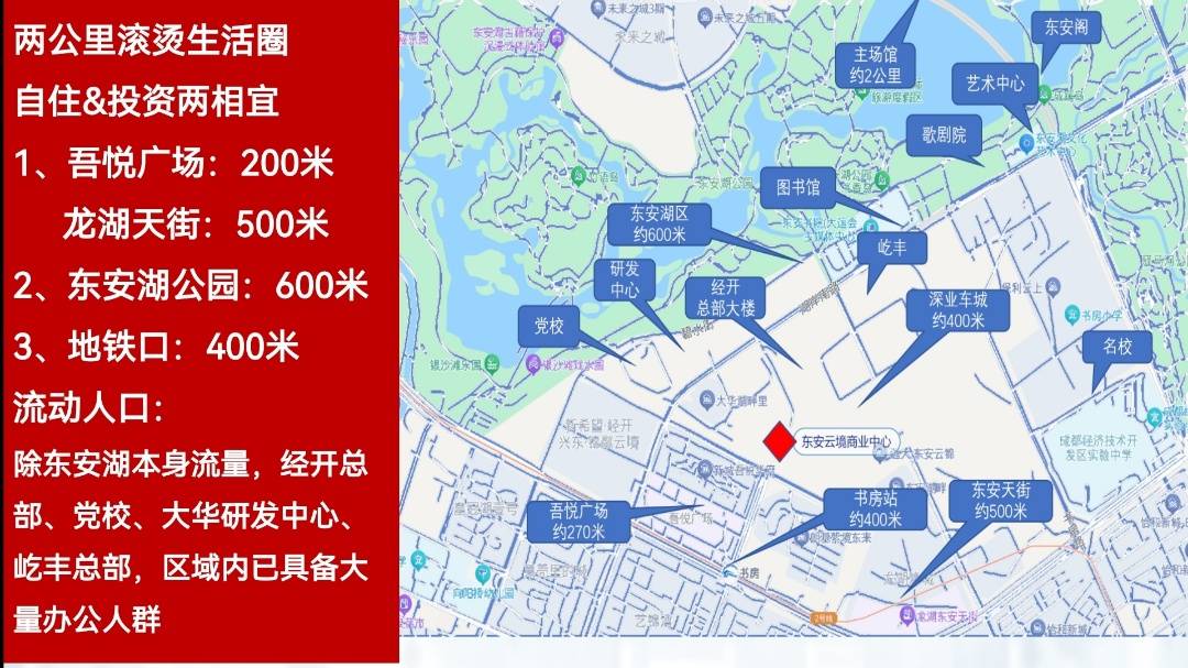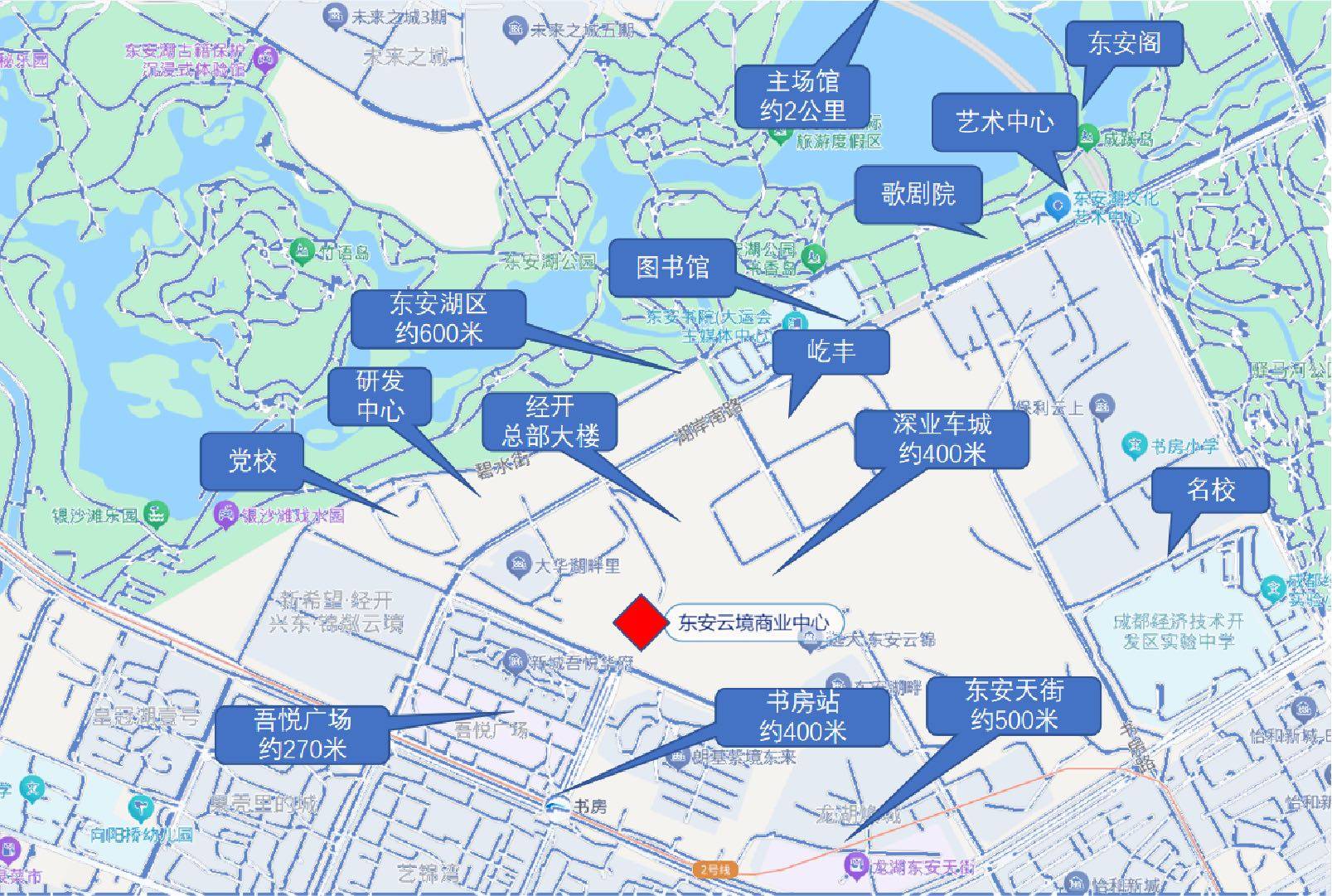 5500亩东安湖生态公园、约1910亩驿马河公园、约32平方公里锦绣天府、全国最大城市森林公园龙泉山森林公园、东安阁酒店、木棉花酒店、图书馆、大剧院、新闻中心等配套环伺;项目占据东安湖中央活力区CAZ核芯位置,项目一线瞰湖高阶产品,引领区域高端商业和楼宇总部发展